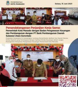 Kerja sama tersebut diwujudkan dengan penandatangan MoU oleh Wali Kota Andrei Angouw, Dirut Bank SulutGo Revino Pepah dan Kepala BPKP Setyan Nugraha di Kantor Pusat Bank SulutGo, Selasa (15/6/2021).
