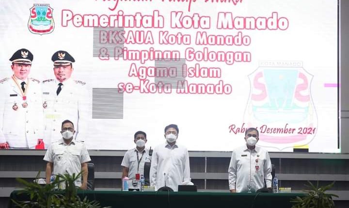 Manado, LiputanMetroNews.com || Hari ini Walikota Manado Andrei Angouw didampingi Wakil Walikota Manado Richard Sualang menghadiri kegiatan Tatap Muka Pemerintah Kota Manado, BKSUA Kota Manado dan Pimpinan Golongan Agama Islam se Kota Manado di ruang serbaguna Pemerintah Kota. Rabu (1/12/2021).