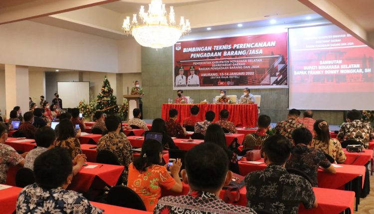 Pemerintah Kabupaten Minahasa Selatan adakan bimbingan teknis perencanaan pengadaan barang/jasa tahun anggaran 2022 yang dibuka oleh Bupati Minahasa Selatan Franky Donny Wongkar, SH Bersama Wakil Bupati Minahasa Selatan Pdt Petra Yani Rembang dan turut di hadiri Kepala Bagian Pengelolaan PBJ pada biro pengadaan barang/jasa Sekretariat Prov. Sulut Felleps Wuisan, ST, Sekretaris Daerah Minsel Denny P. KAAWOAN, SE., M.Si., para Asisten, yang menghadirkan para Kepala Perangkat Daerah se-kabupaten Minsel dan seluruh peserta bimtek (pa/kpa, ppk dan operator sistem informasi rencana umum pengadaan (sirup)).