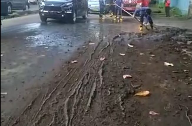 Pemadam Kebakaran Kota Manado pun turun tangan membantu membersihkan jalan yang berlumpur ini.