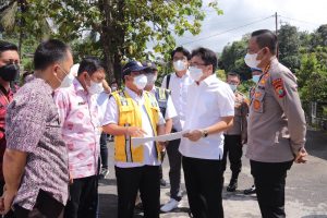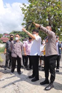 Wali Kota didampingi Tim Teknis Balai Wilayah Sungai (BWS) Sulawesi I, Kadis PUPR Kota Manado Johny Suwu dan Tim serta Lurah Karombasan Utara ketika melakukan peninjauan lokasi. Terdapat beberapa petugas Polisi dari Pihak SPN Polda Sulut yang juga ikut bersama-sama tim melihat kondisi saluran air di kompleks ini.