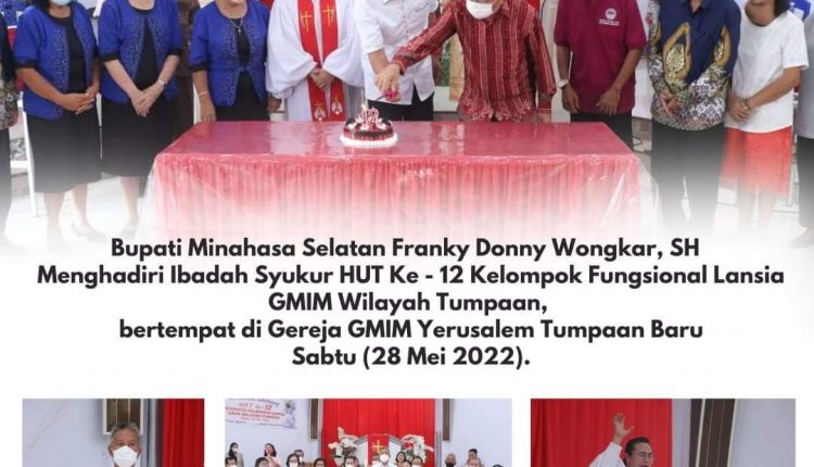 LIPUTANMETRONEW, Minsel- Bupati Minahasa Selatan Bpk. Franky Donny Wongkar,SH menghadiri Ibadah Syukur Hut Ke-12 Kelompok Fungsional Lansia GMIM wilayah Tumpaan bertempat di Gereja Gmim Yerusalem, Tumpaan Baru, Sabtu 28 Mei 2022.