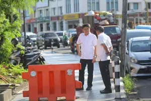 Kunjungan dilanjutkan di ruas jalan boulevard depan Mega Mall, di mana Wali Kota dan Kepala Dinas PUPR bersama-sama menelusuri trotoar, mengamati kondisi drainase mulai dari depan Mega Mall hingga Hotel Arya Duta yang rencananya akan mendapatkan perbaikan.