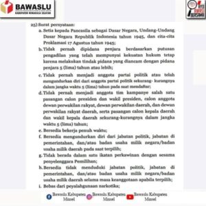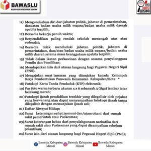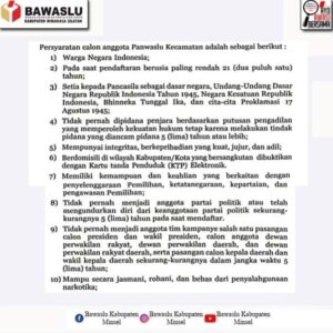 Dalam surat edaran tersebut, sejumlah persyaratan telah dicantumkan secara rinci. Kriteria penerimaan calon anggota Panwaslu Kecamatan didasarkan pada kemampuan individu masing-masing dengan kategori persyaratan yang diumumkan secara terbuka.