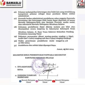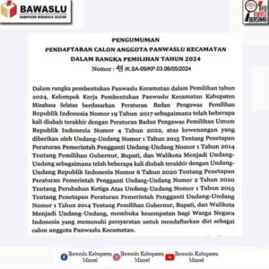 Liputanmetronew – Minsel, 3 Mei 2024 – Badan Pengawas Pemilu (Bawaslu) Kabupaten Minahasa Selatan resmi membuka pendaftaran bagi calon anggota Panwaslu Kecamatan (Panwaslucam) untuk Pemilihan Kepala Daerah (Pilkada) 2024. Pendaftaran ini mengacu pada surat edaran nomor: 49/K.SA-09/KP.03.06/05/2024 tentang pengumuman pendaftaran calon anggota Panwaslu Kecamatan dalam rangka pemilihan tahun 2024.