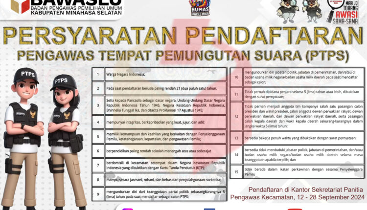Minsel, Liputanmetronews – Menjelang Pemilihan Kepala Daerah (Pilkada) serentak 2024, Badan Pengawas Pemilihan Umum (Bawaslu) Kabupaten Minahasa Selatan, Sulawesi Utara, membuka lowongan untuk rekrutmen Pengawas Tempat Pemungutan Suara (PTPS). Sebanyak 401 orang petugas PTPS akan direkrut untuk memastikan pelaksanaan Pilkada berjalan dengan jujur dan adil di 177 desa dan kelurahan di wilayah tersebut.