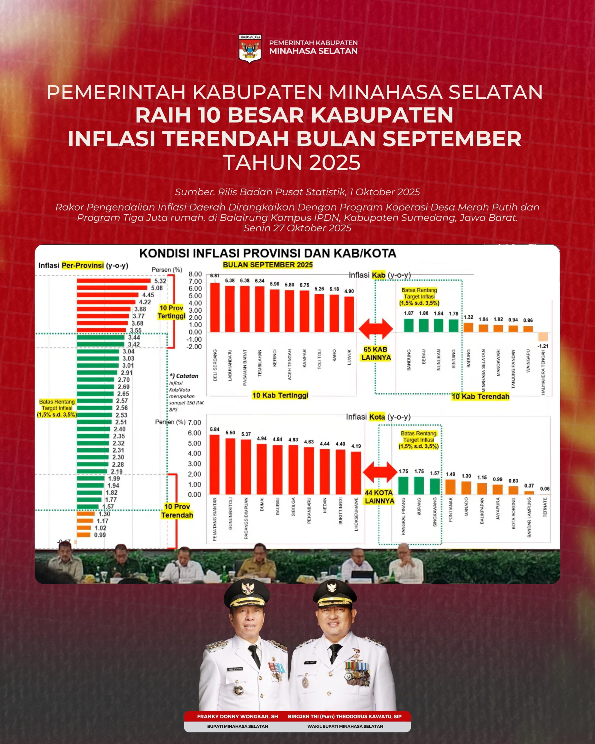 Dengan masuknya Minahasa Selatan ke dalam daftar 10 Kabupaten/Kota dengan inflasi terendah se-Indonesia, daerah ini menunjukkan bahwa konsistensi dalam tata kelola ekonomi dan kebijakan yang berpihak pada rakyat mampu menghasilkan dampak nyata bagi stabilitas dan pertumbuhan ekonomi daerah.
