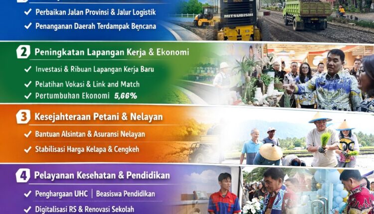 Dalam pelaksanaannya, berbagai program strategis telah menunjukkan progres nyata di sejumlah sektor utama. Pada sektor infrastruktur dan konektivitas, Pemprov Sulut melalui Dinas PUPR terus mempercepat perbaikan jalan provinsi, khususnya pada jalur-jalur yang menjadi urat nadi logistik dan akses ekonomi masyarakat. Pemeliharaan rutin hingga rekonstruksi jalan di titik-titik terdampak cuaca ekstrem terus dilakukan secara bertahap. Ke depan, Sulawesi Utara diarahkan menjadi hub logistik internasional di kawasan Timur Indonesia melalui penguatan konektivitas udara, laut, dan darat guna menekan biaya logistik nasional.